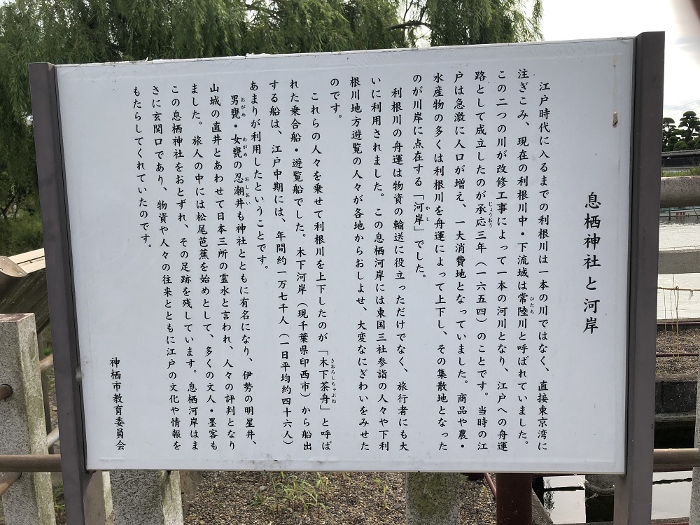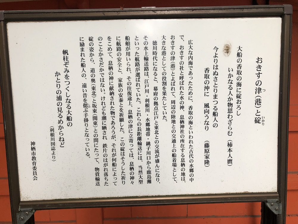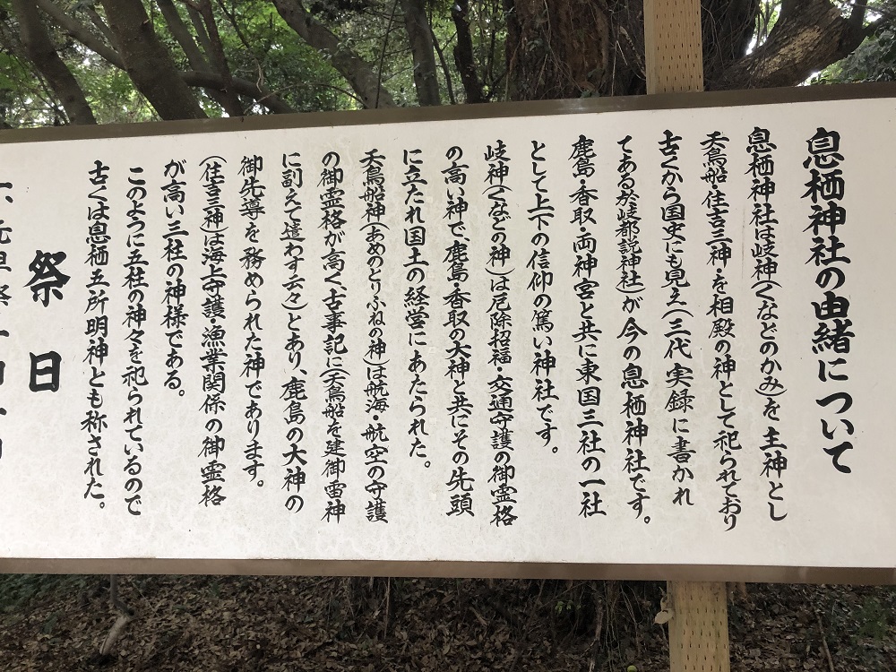 『息栖神社の創祀は応神天皇の御代と伝えられるものの祭神の御神格からして神代時代に鹿島・香取両神社の御祭神に従って東国に至り、鹿島・香取の両神宮は其々台地に御鎮座するものの久那斗及び天鳥舟神は海辺の港に姿を留めてやがて応神朝に神社として祀られたと思われます。・・・・・』
