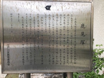 「この鹿見塚のあるあたりは、昔から鹿骨発祥の地といわれています。伝説によると、戦国時代のころ、攻防のはげしい世の中を離れ、安住の地を求めて、石井長勝・牧野一族・田島一族・中代一族および別系の石井一族が開拓しました。ある日のこと、日頃尊崇している鹿島大神が常陸から奈良へ向かう途中、大神の杖となっていた神鹿が急病でたおれたので、塚を築きねんごろに葬った所だと伝えられています」
