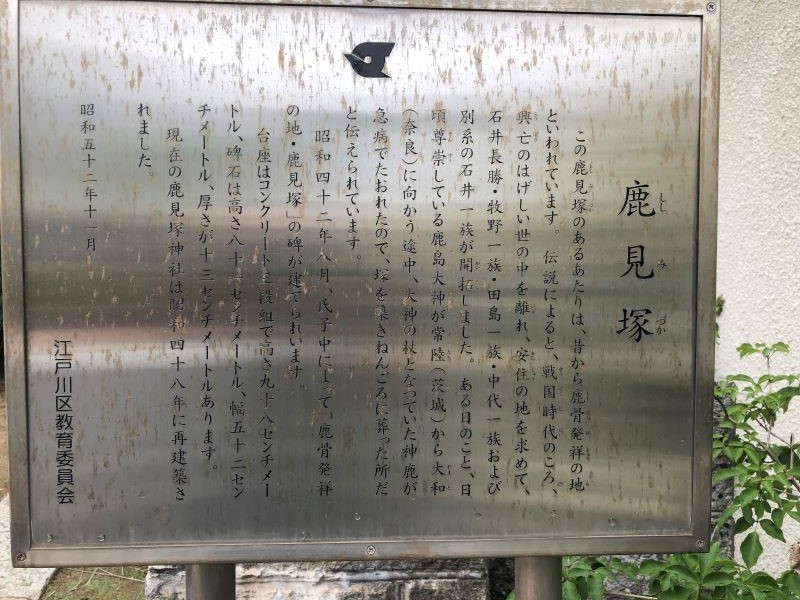 戸城邸を訪れた日、足を延ばして「鹿見塚神社」へ参拝した。いや、むしろ、今日の主役はこの神社だったのだ。ご由緒は昭和52年に江戸川区教育委員会が建てた「案内板」にある。写真から読めるだろうか?読めたとしても、教育委員会の文章としては時代認識が違うような気がするので下記するので諸兄のご意見を待ちたい。曰く