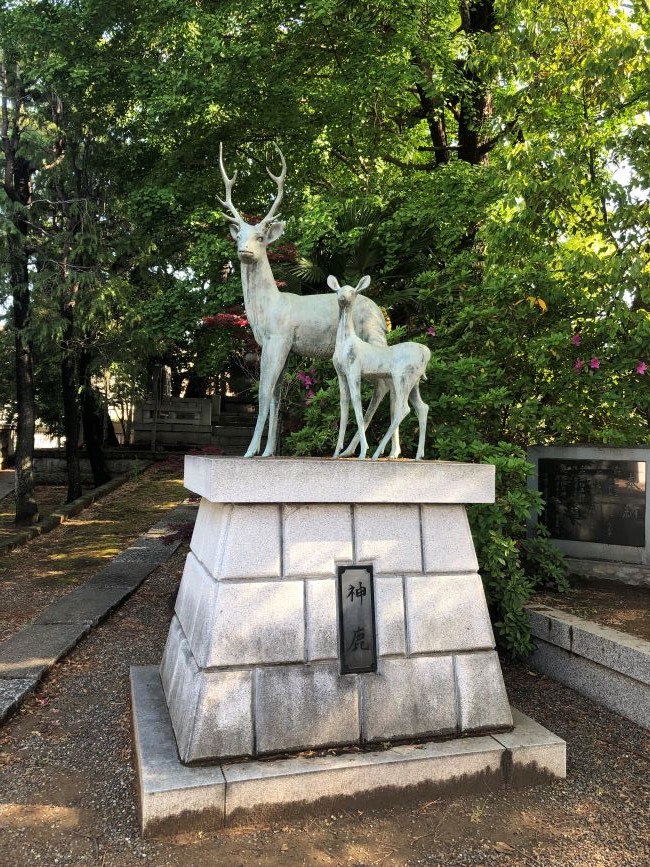 「768年、藤原氏が氏神である鹿島の大神の御分霊を奈良にお迎えして春日大社を創建するにあたり、御分霊を神鹿の背にのせ奈良へと進みました。その足跡は、東京都江戸川区の鹿骨鹿島神社を始めとして、東海道を三重県の名張まで言い伝えが残されており、この伝承から奈良の神鹿の起源は鹿島に求めることができます」