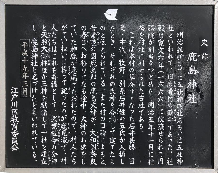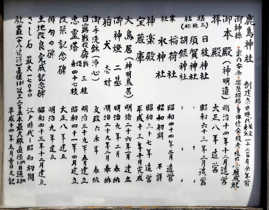 我々がこの神社を訪れたのは、鹿島神宮の「鹿苑」の案内板で読んだ文章に惹かれたからだ。これも私の「鹿島神宮参拝記」に載せてあるが、読めないといけないので下記する。
